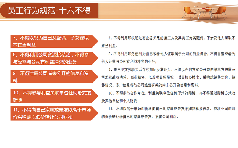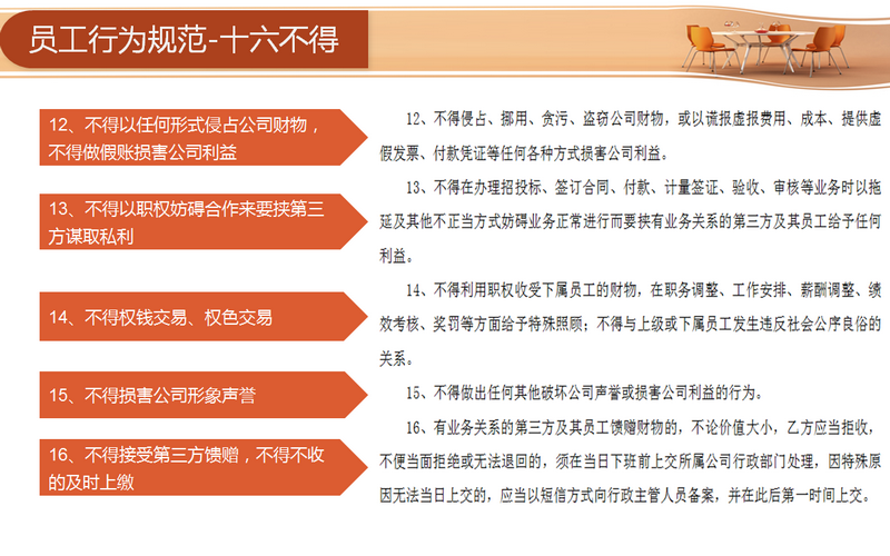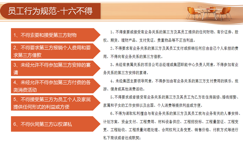 宣講環(huán)節(jié)主要從四個方面著手:分別為“目的、行為規(guī)范約定、違約責(zé)任與管理和連帶責(zé)任”。員工需要從十六方面規(guī)范自身的行為,包括不得索要和接受第三方財(cái)物、不得要求第三方報(bào)銷個人費(fèi)用和要求第三方借款、未經(jīng)允許不得參加第三方安排的宴請等等。